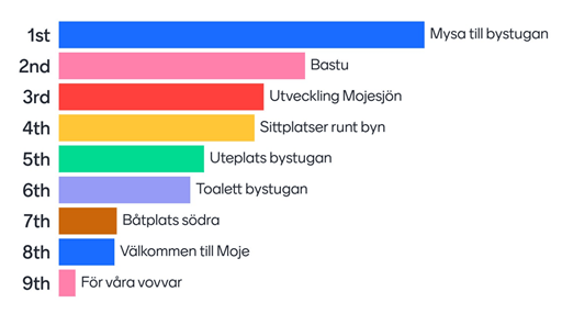 Då Moje byförening inte har stora egna medel förutsätts att finansiering kan säkras på andra sätt än genom Moje byförenings ordinarie budget. Prioritering av förväntat resultat kommer att genomföras när vi vet hur stor budget projektet har. Stora resursinsatser kommer också att krävas av byborna. Intressegrupper och arbetsgrupper har börjat bildas och det är viktigt att alla i byn får chans att bli inkluderade i genomförandet. Tiden för genomförande är planerat till under 2022 och det viktigaste är att resultatet blir uppskattat av oss som bor i Moje.